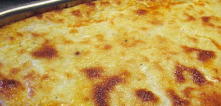 inclui camadas de beringela e carne, cobertas por molho bechamel e é gratinado